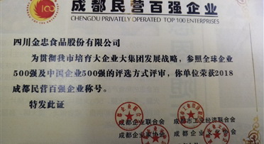 金忠食品喜獲2018成都民營(yíng)百?gòu)?qiáng)企業(yè)、制造業(yè)百?gòu)?qiáng)企業(yè)稱(chēng)號(hào)